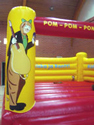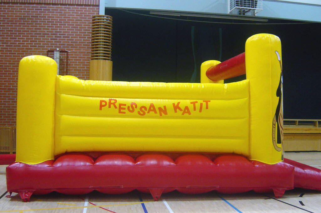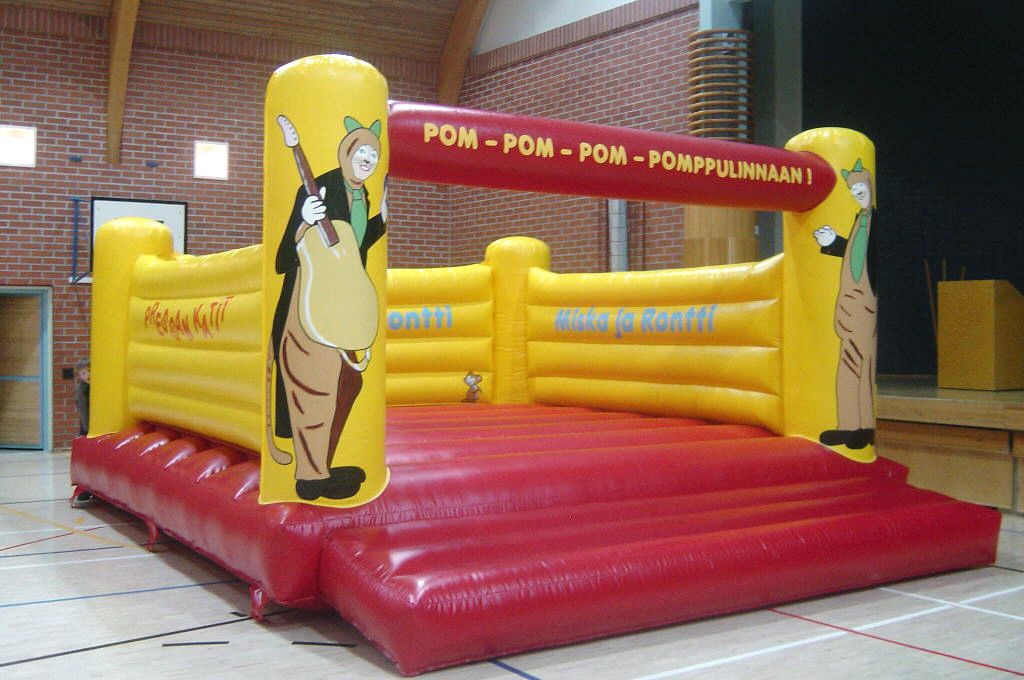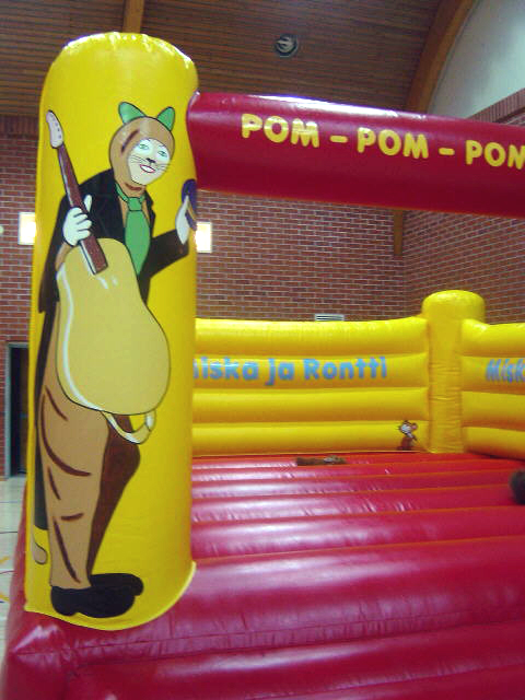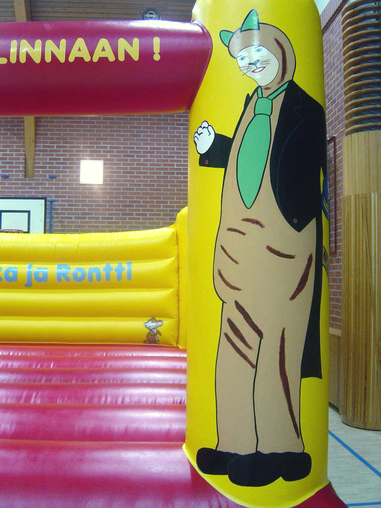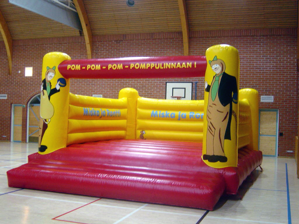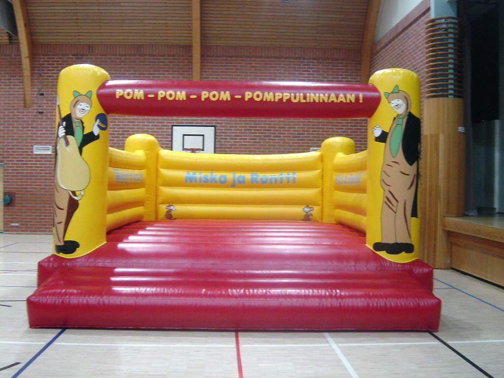 Sivuilla on Pressan Katit -tekstit! Linnan sisällä Miska ja Rontti-tekstit! Miska ja Rontti juhlistavat pomppulinnaan etutolpissa! Ilmantäyttökone pumppaa linnaan jatkuvasti uutta joustavaa ilmaa!